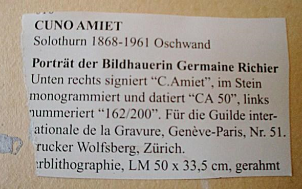 Cuno Amiet Lithographie „Bildhauerin Germaine Richier“ von 1950, nummeriert 162/200