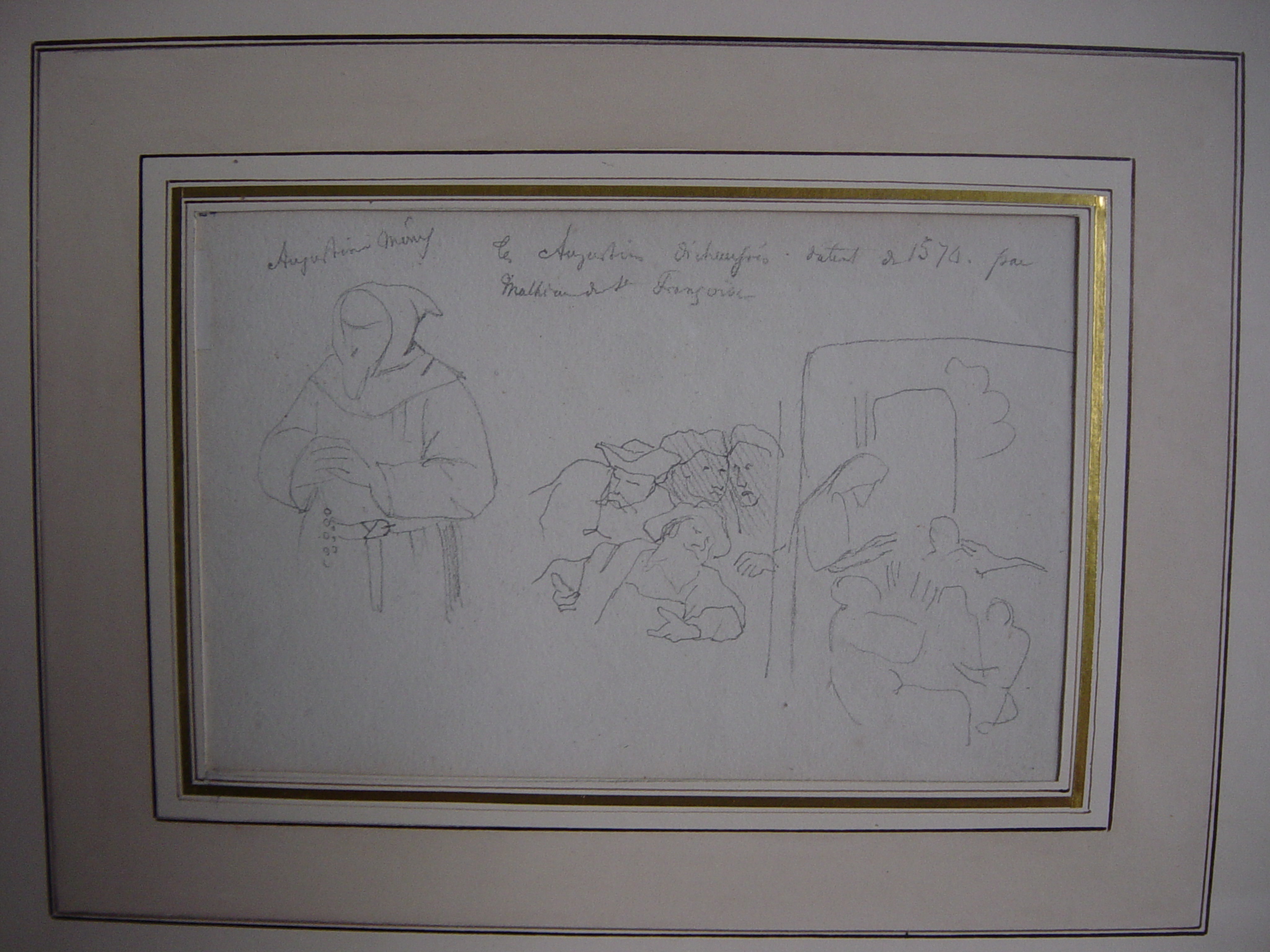 Rückseite: Skizze mit Mönch und Ratsherren-Szene (mit handschriftlichem Vermerk)