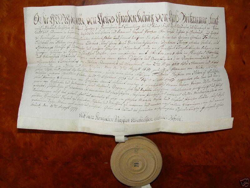 königliche Lehensurkunde des Königs von England Georg III. mit Siegel vom 11. August 1779.