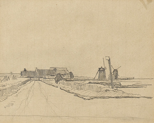 Bleistift-Zeichnung von Albert Anker „Landschaft mit Windmühlen“, aus Skizzenbuch, wohl um 1855.