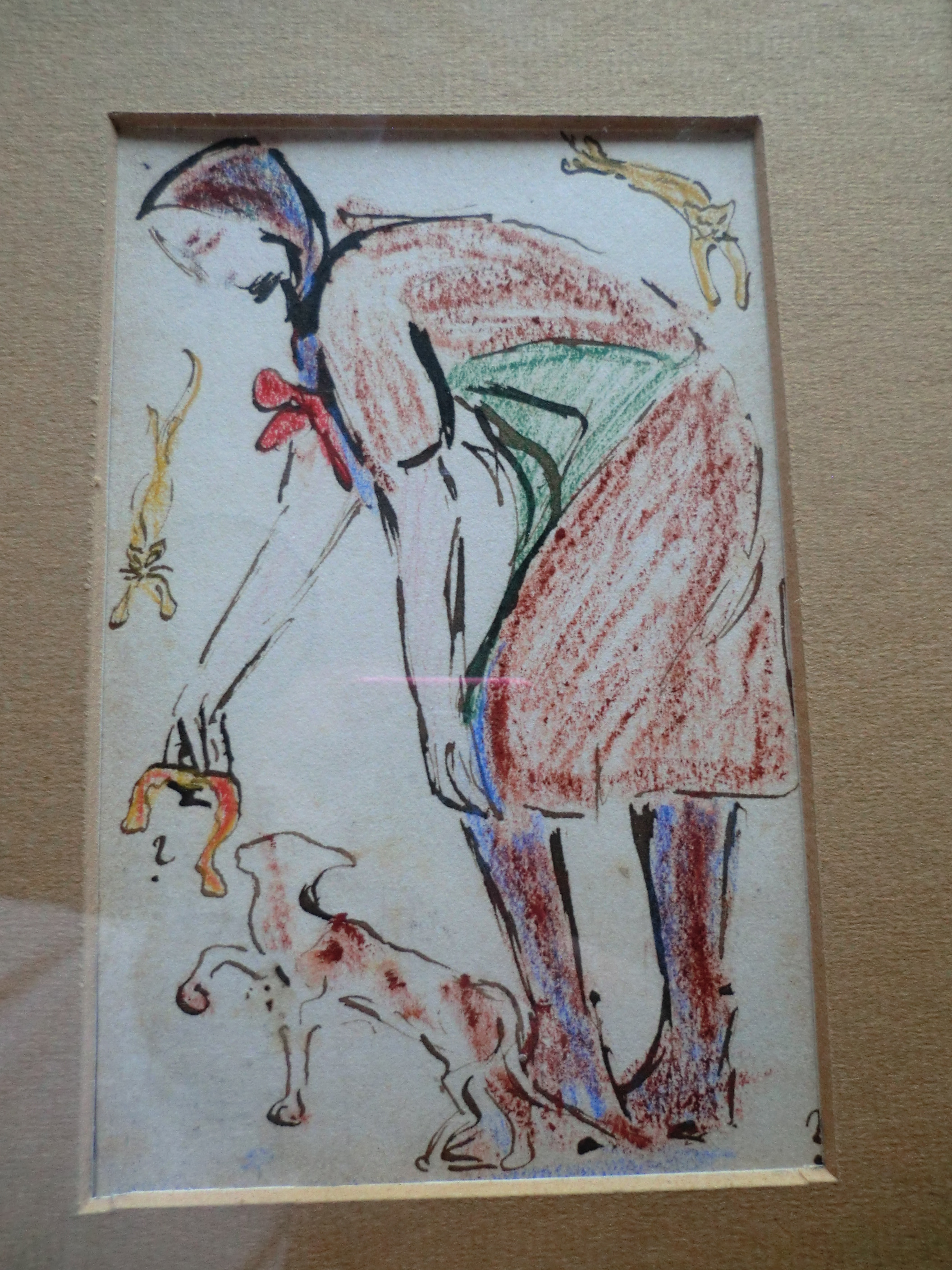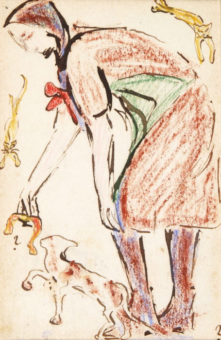 Künstlerpostkarte – Bauernmädchen lockt Katzen
