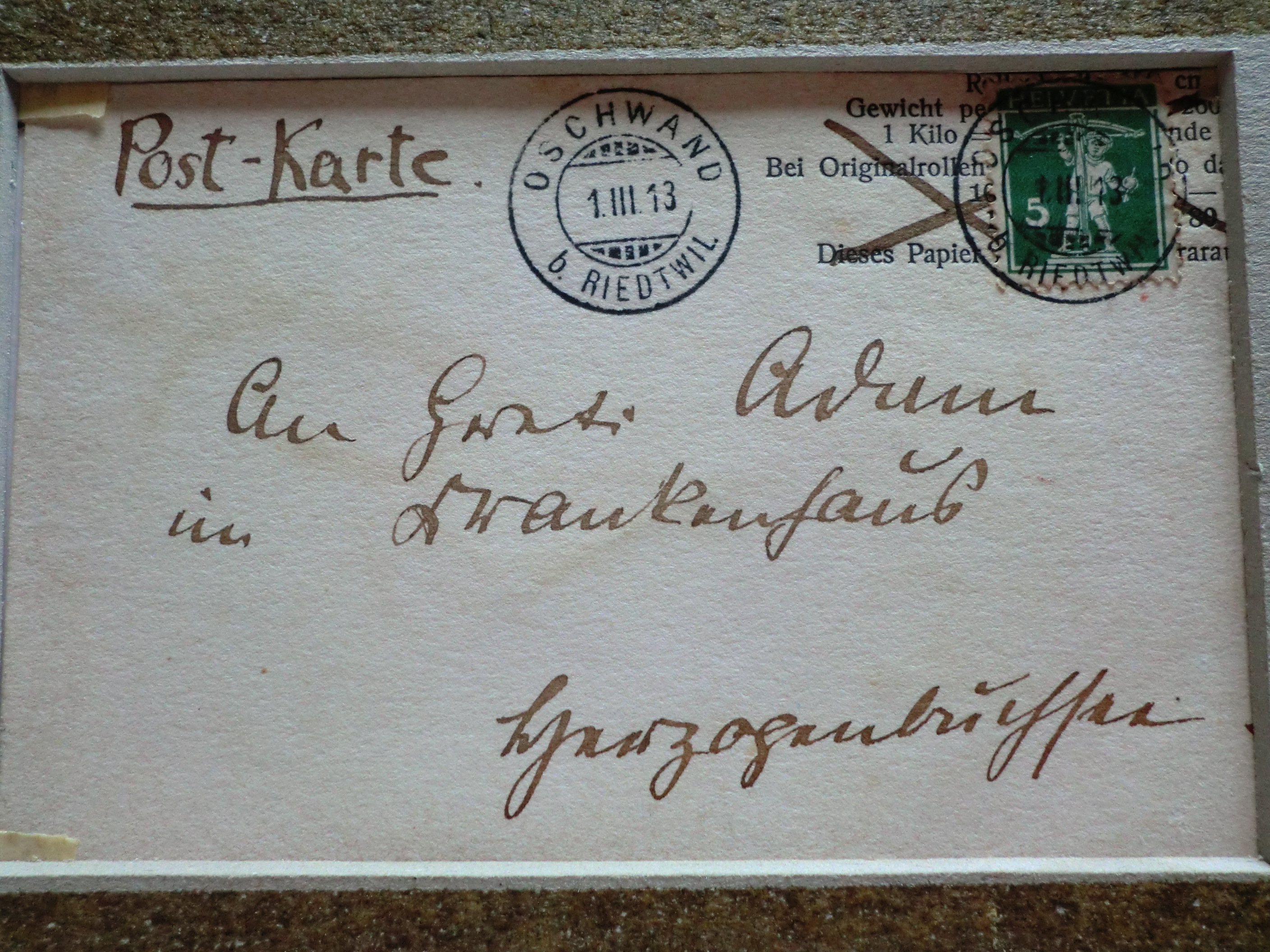 Rückseitig bezeichnet „An Greti Adam im Krankenurlaub, Herzogenbuchsee“, mit Poststempel „Oschwand bei Riedtwil 1.III.13“ und 5 Rp. Marke.